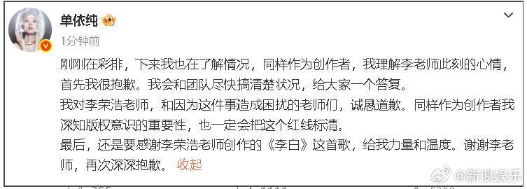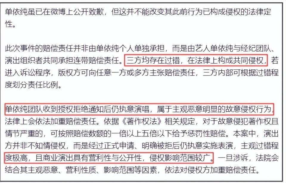 单依纯方在演唱会排练间隙匆匆发文道歉,但按律师的说法,她侵权这事是板上钉钉,哪怕道歉也难以撇清责任。