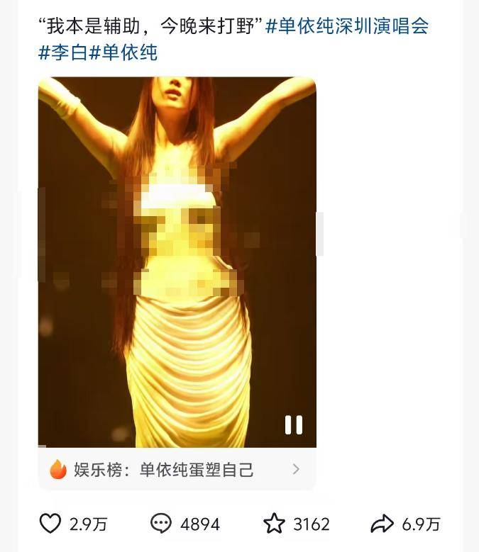 有网友晒出单依纯昨天《李白》的演出视频,确实不太符合主流审美,有点像蹦迪舞曲,穿着打扮清凉,动作也摇头晃脑。