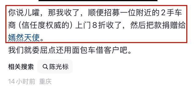 由此看出当下陈光标的困境,退不但违反当初的许诺,而且还会影响其后续带货(能够参与直播带货,个人感觉都有目的)。进很可能与其原本的意思不同,要知道1300万的豪车可不是闹着玩的,如果没有足够的等量交换,相信任何一个人都不会轻易赠予。