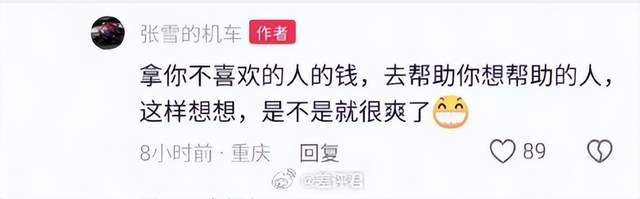 与此同时,张雪还毫不掩饰地表达了对陈光标的一些看法:拿你不喜欢的人的钱,去帮助你想帮助的人,这样想想,是不是很爽了。