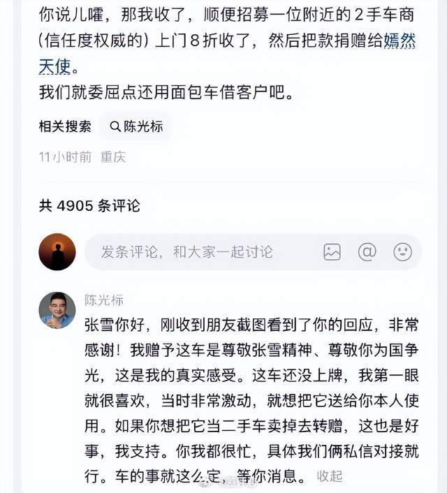 被对方将了一军之后,陈光标则在留言处换了一种态度,给人的直观感觉好似他并没有那么真诚:赠予的初衷是供张雪个人使用,若转赠是误会了我的初心。