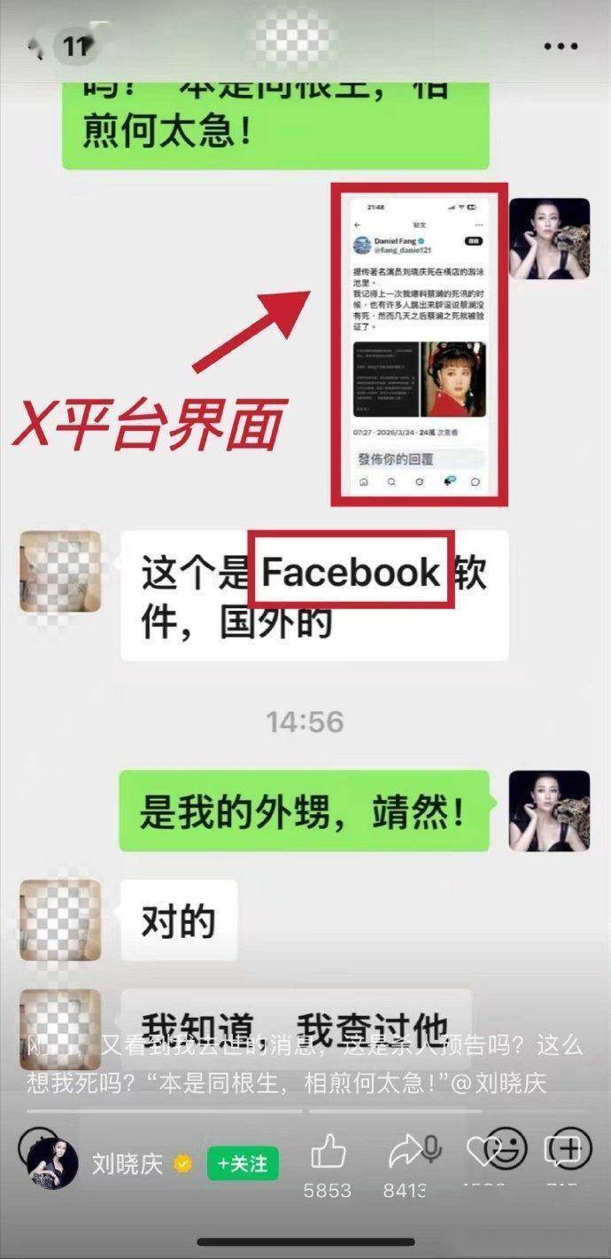 最有意思的是他扒出来的一个 “乌龙细节”。网传的造谣帖子明明发在 X 平台(以前的推特),但告诉刘晓庆 “这是 Facebook” 还号称 “查过了就是靖然干的” 那位 “高人”,简直是把 “指鹿为马” 玩得明明白白。