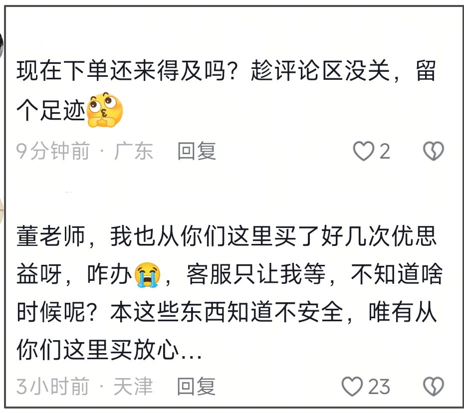 在优思益爆雷风波之后,很多带货的明星和网红都给出了正面的回应,要么第一时间道歉,要么退款或者退一赔三,但是“与辉同行”直播间和董宇辉本人却始终没有正面回应此事,这一态度自然引发消费者强烈不满,董宇辉社交账号的评论区很快沦陷。