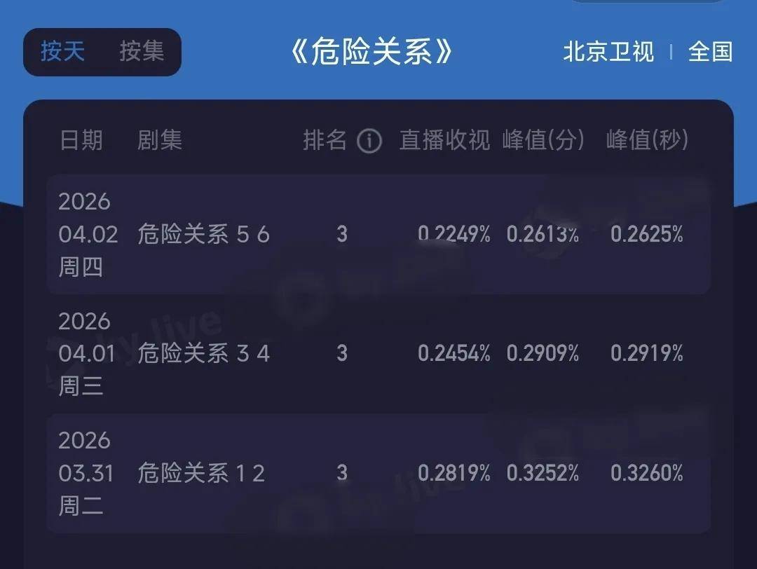 线下成绩方面,《危险关系》由东方、江苏和北京三大卫视上星播出。开播的时候收视率成绩还算不错,但是剧情却没能留住观众。三大卫视的收视率一天比一天低,该剧的收视成绩也是越来越差,实现了台网双扑街。