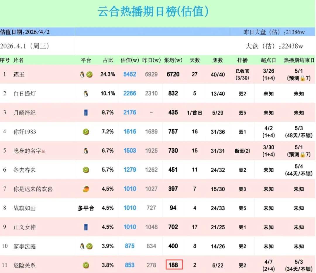 《危险关系》成绩不佳也是为行业敲响警钟,即使平台头铁愿意启用立场具有争议的演员,无视观众抵制的声音,但最后播出成绩如何还是要看观众对作品买不买账。什么时候行业学会尊重观众了,什么时候行业的春天也就来了。