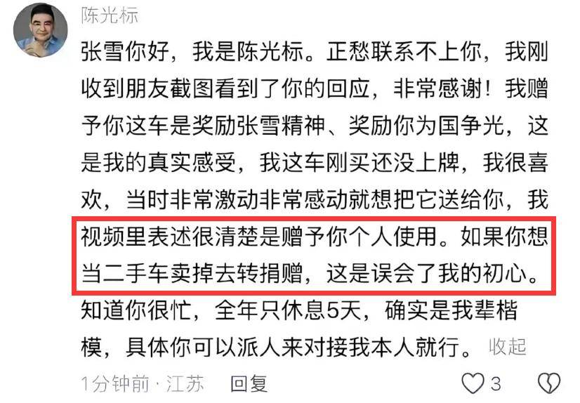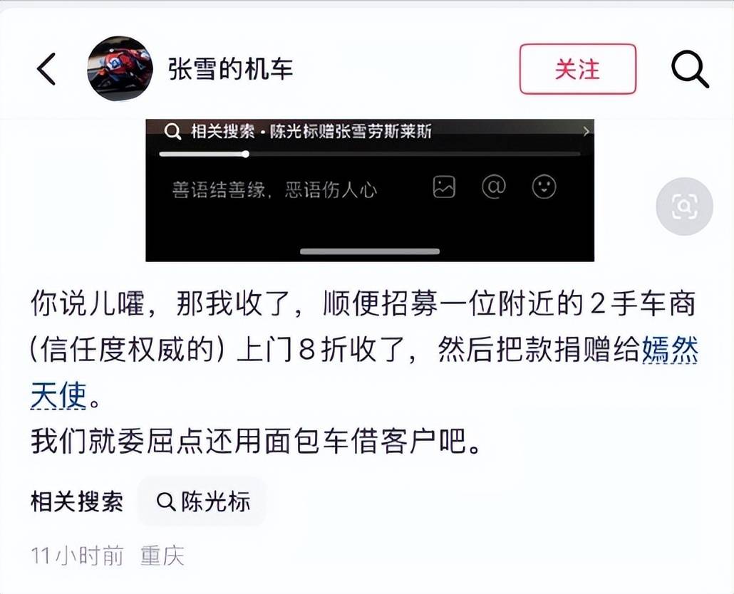 这篇回应中,场面客套话少不了,但主题也是很鲜明,即张雪要把车卖掉去捐赠,这是误会了他的初心。