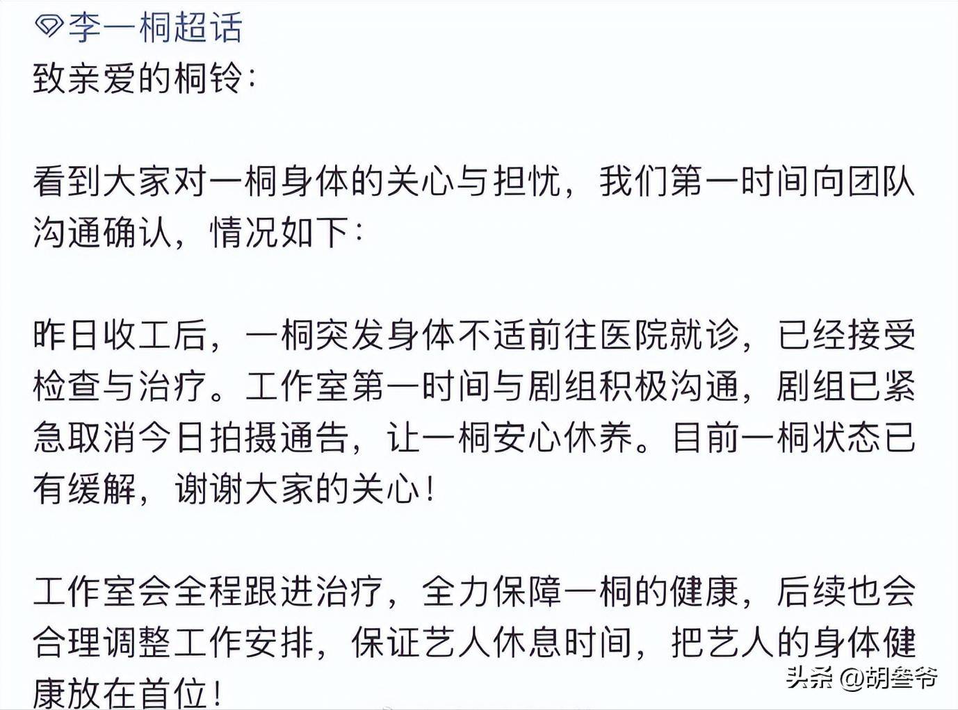 4月2日晚上,李一桐工作室通过粉丝官方账号发了说明,明确回应了急诊这件事。