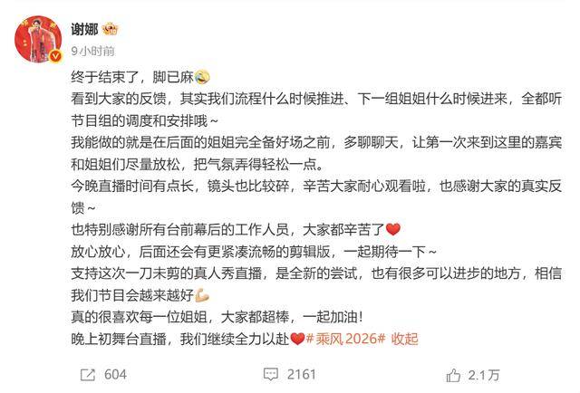 4月3日凌晨,谢娜 发文回应《乘风2026》直播节奏慢等争议,她表示,“其实我们流程什么时候推进、下一组姐姐什么时候进来,全都听节目组的调度和安排哦~后面还会有更紧凑流畅的剪辑版,支持这次一刀未剪的真人秀直播,是全新的尝试,也有很多可以进步的地方,相信我们节目会越来越好。”在直播时她也表示弹幕不要催促,需要听导演安排。