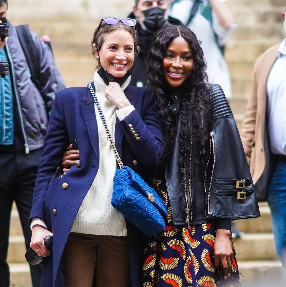 时装周和老姐妹“黑珍珠”合照,她戴着口罩,顶着眼镜,一条高领包得严严实实。