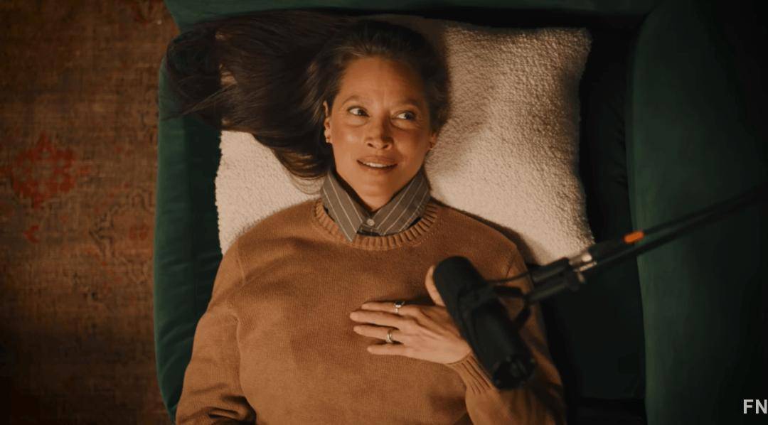 参加播客访谈,她素面朝天,明显的泪沟、微白的发根。