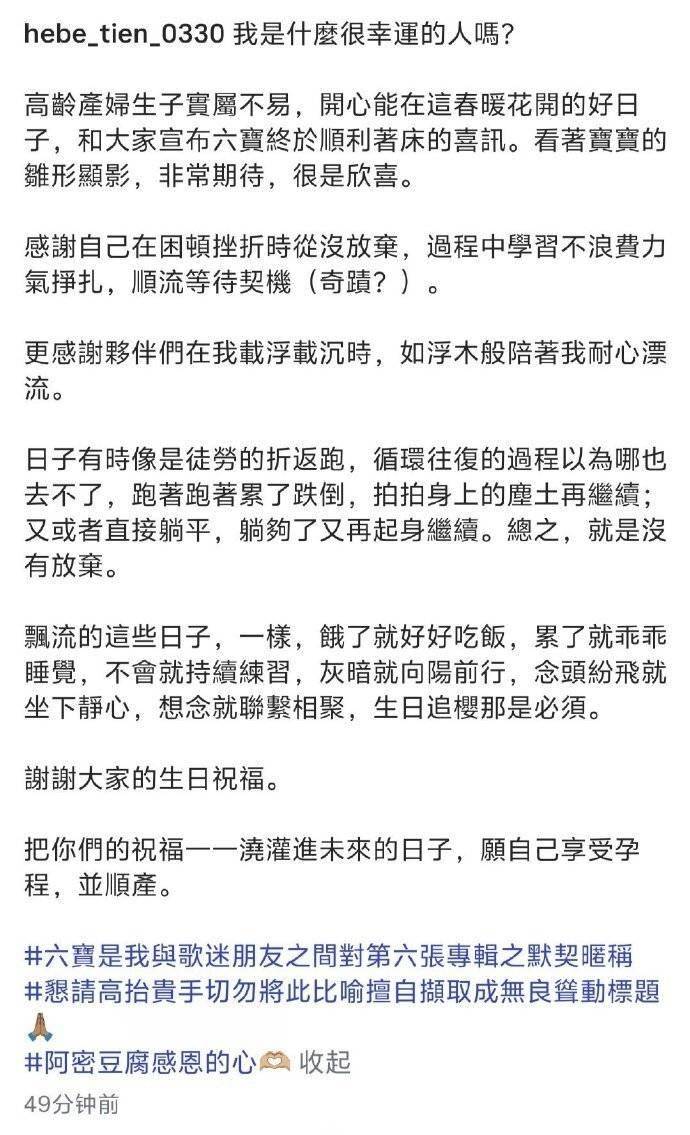 43岁生日当天,田馥甄在外网社交平台晒出樱花树下美照,配文“六宝顺利着床”,正式官宣第六张个人专辑进入制作阶段。粉丝们激动不已,毕竟距离上一张专辑已过去五年,这&