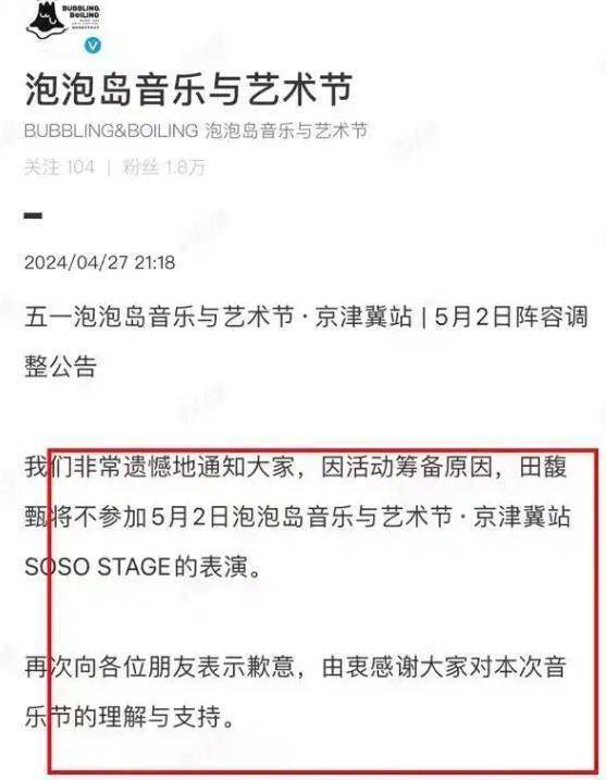 2024年4月,天津泡泡岛音乐节官宣田馥甄为压轴嘉宾,这是她试图重返内地市场的重要尝试。
