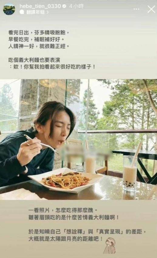 可就在当晚,田馥甄在外网发布两条动态,一条晒出意大利面照片,配文“不用打肿脸,午睡醒来就是肿脸”;另一条夸赞“意大利面好吃,扳回一城”。