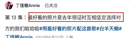 公开信息显示,丁佳敏和周力源早在 2022 年 9 月就订了婚,2023 年 6 月正式登记结婚。领证之后的很长一段时间里,她的账号更新频率都很低,直到 2023 年 1 月才恢复高频更新。