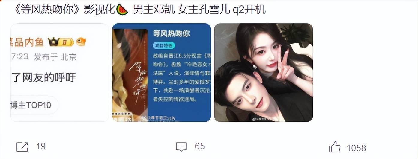 现在,很多网友都希望邓凯和孔雪儿可以二搭,根据知情人士透露,将二搭拍摄《等风热吻你》,这部剧讲述的是付雪梨与许星纯,在青春期相互喜欢彼此,却因为现实的冲突分手。