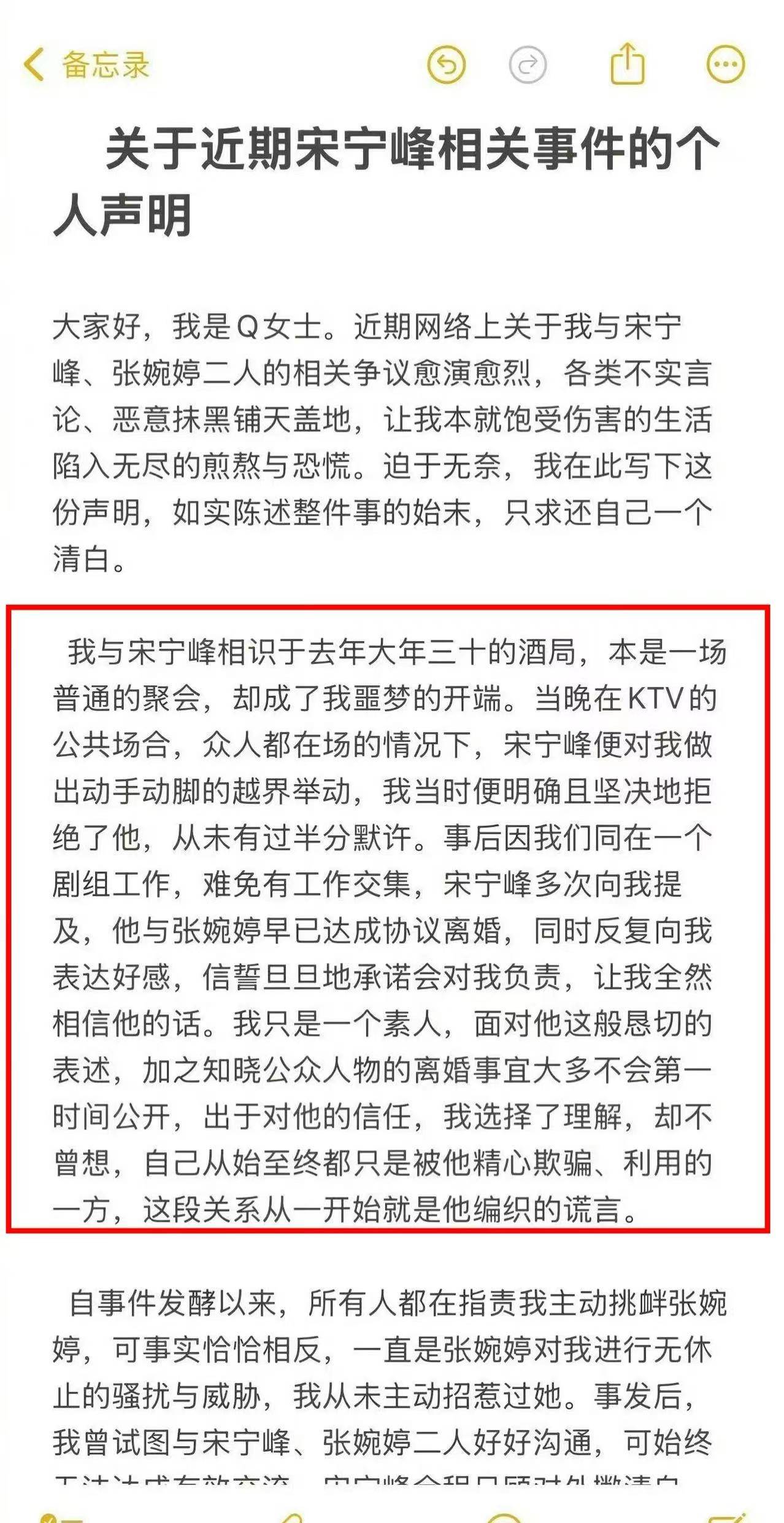 Q女士透露她和宋宁峰认识的过程,是在去年大年三十的酒局上,宋宁峰可能比较钟意她,对她动手动脚,很令Q女士反感。Q女士一定都是拒绝宋宁峰,因为同一剧组工作,宋宁峰一直纠缠她,表示他与张婉婷早已达成离婚协议,反复向Q女士表达好感,信誓旦旦地承诺对她负责,让她全然相信他的鬼话。