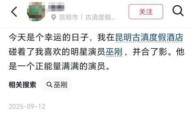 去年9月的时候,也有网友在昆明遇到巫刚,夸他人很和善,还成功合上影了。