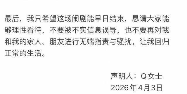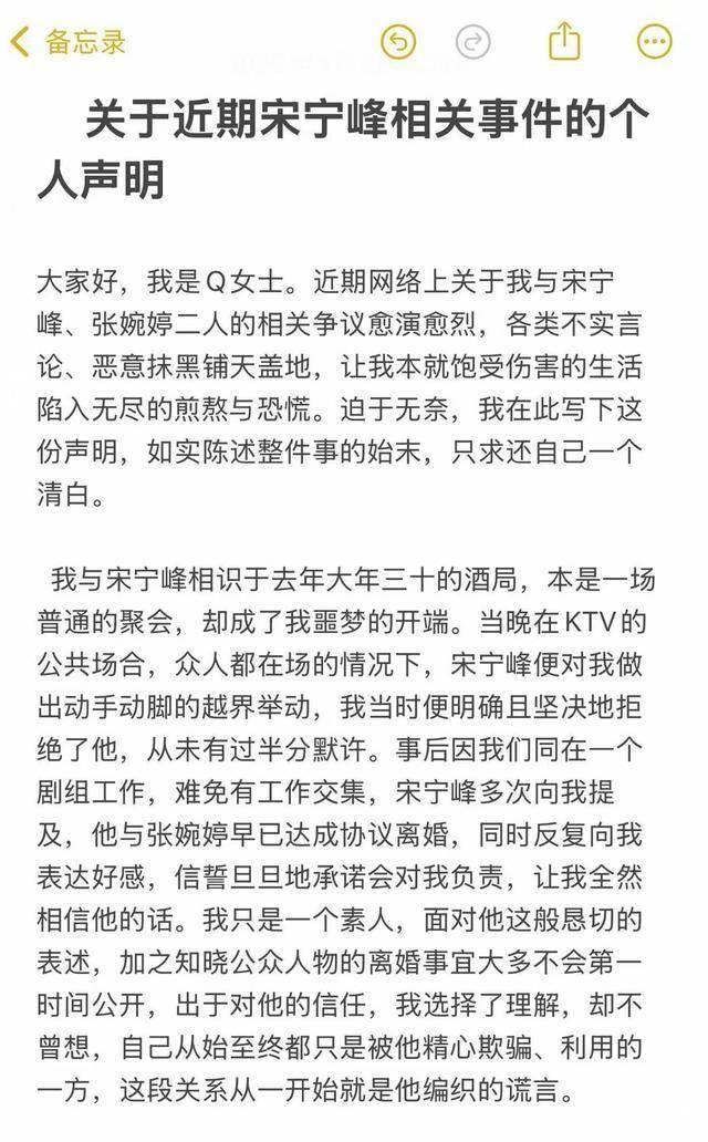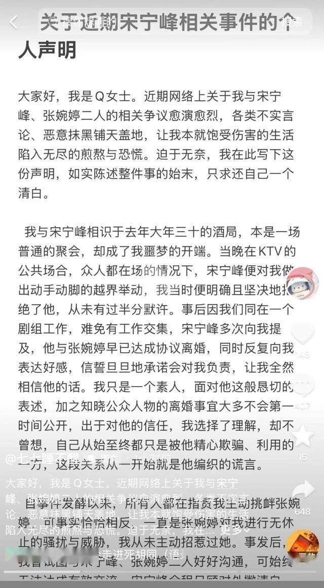 4月3日深夜,宋宁峰出轨事件的“小三”Q小姐现身了,发布声明,谴责宋宁峰与张婉婷。