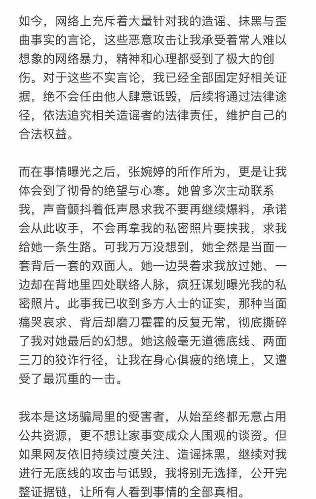 事情曝光后,张婉婷主动联系Q小姐,恳求她不要爆料,承诺不会再拿她的私密照片威胁。