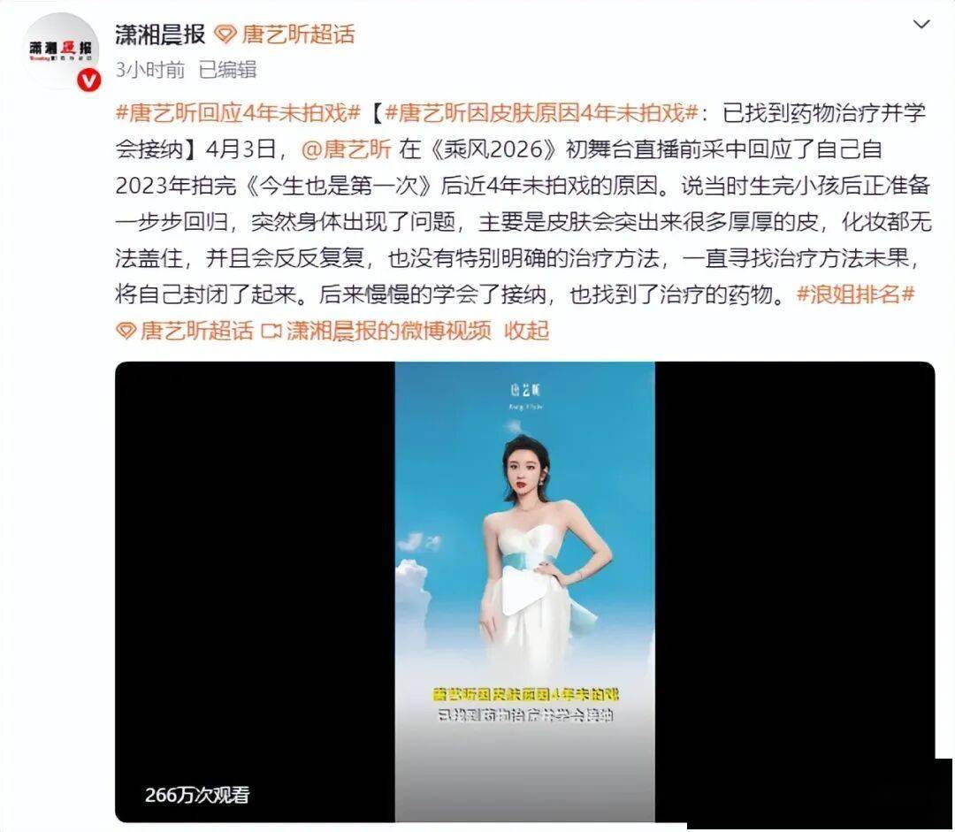 4月3日,唐艺昕在《乘风2026》初舞台直播前采中回应了自己自2023年拍完《今生也是第一次》后近4年未拍戏的原因。说当时生完小孩后正准备一步步回归,突然身体出现了问题,主要是皮肤会突出来很多厚厚的皮,化妆都无法盖住,并且会反反复复,也没有特别明确的治疗方法,一直寻找治疗方法未果,将自己封闭了起来。后来慢慢的学会了接纳,也找到了治疗的药物。