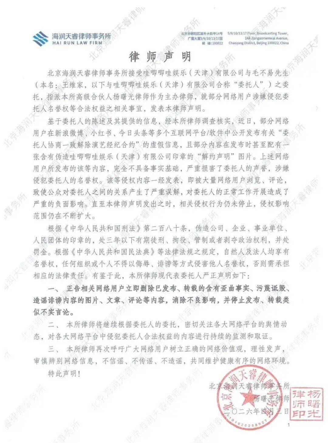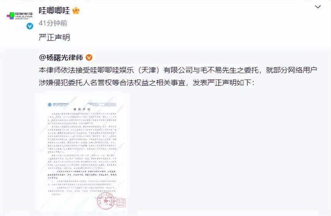 近日,网传毛不易和哇唧唧哇已解除经纪合约,引发热议。4月3日,哇唧唧哇转发律师声明否认此消息,声明表示伪造公章涉嫌违法,并正告相关网络用户立即删除已发布、转载的含有歪曲事
