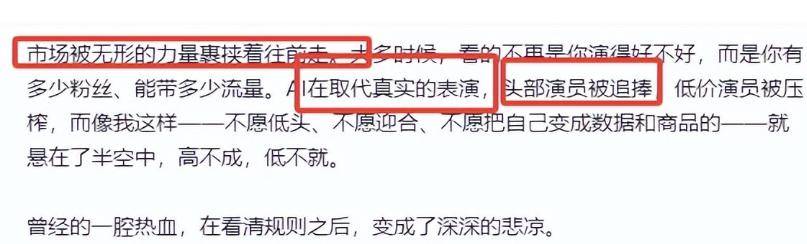 她在那篇较长的文章之中书写得十分的直白,很多时候,人们所看重的不再是你究竟演得怎么样,而是你到底拥有多少的粉丝、能够带来多少的流量。