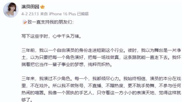 但是就在4月3号的那一天,她忽然发表了一篇篇幅较长的文章,声称自己要从演艺圈中退出。