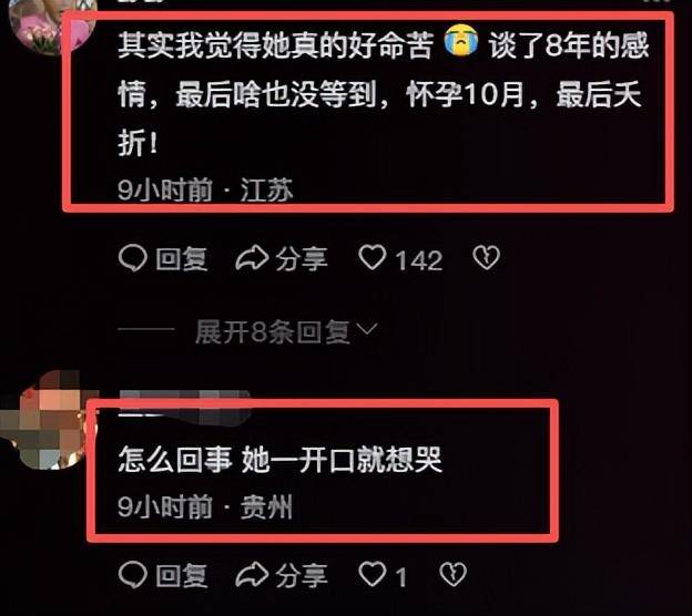 还有人说:“其实我觉得她真的好命苦,谈了8年的感情,最后啥也没等到,怀孕10月,最后却没能留住孩子。”这两句评论,说出了很多人的心声。