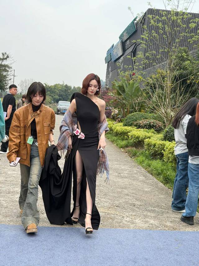 身着不对称斜肩黑裙,裙摆缀着嫩粉手工绢花,高开衩设计衬得腿又细又长。