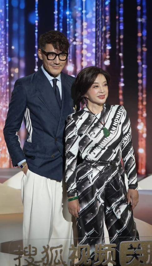 和54岁的胡兵牵手出场,一身黑白色调衬衫搭配阔腿长裤,彻底摒弃了传统意义上的“老年礼服”。
