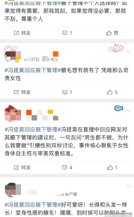但更多的网友选择站在冯提莫这边,大家纷纷表示,女性的身体从来都该由自己做主,刮不刮体毛、做不做所谓的 “管理”,全凭个人意愿,根本不该被世俗的单一审美绑架,更不该存在这种男女有别的双重标准。