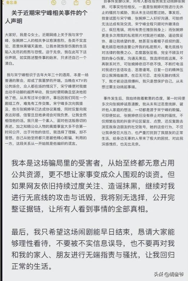 大量聊天记录、录音、声明接连流出,把演员宋宁峰、妻子张婉婷、第三者Q女士这三个人的烂摊子彻底摊在了公众面前。