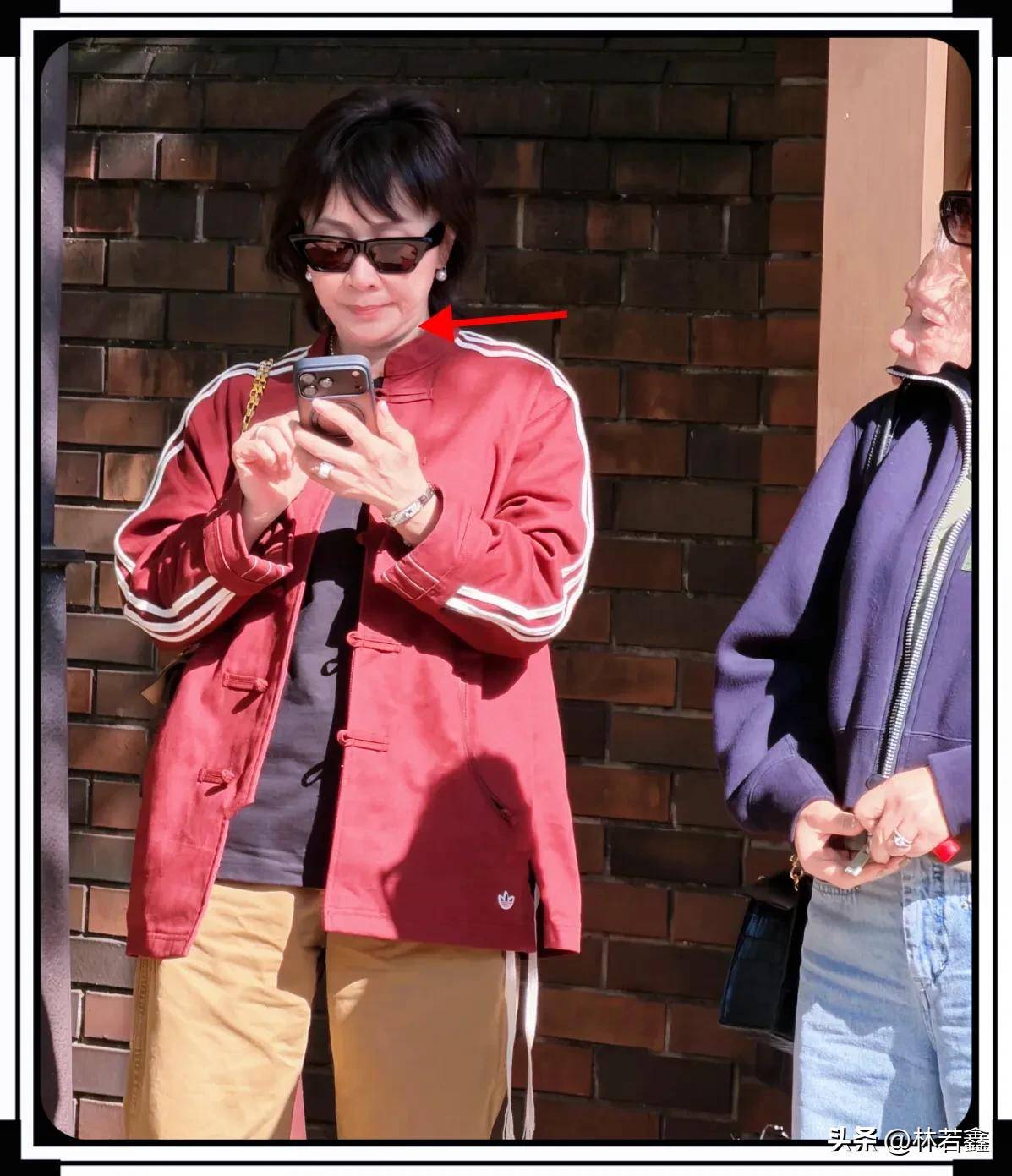 刘嘉玲拿手机在发信息,旁边站着的应该是刘嘉玲的妈妈王馥梅,今年80岁了,可是整个人状态超级好,想必等嘉玲姐80岁的时候也会像妈妈一样,优雅!