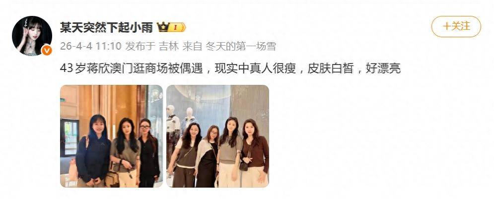 天呐,蒋欣这个脸真的好小啊,华妃娘娘的仪态果然不同凡响。一位网友的评论道出了不少人的心声。在晒出的合照中,蒋欣留着一头顺滑的长发,化着淡雅的妆容,脸上始终挂着温暖的微笑。目击者们纷纷感慨:一米七一的大高个,又瘦又美,脸上没有一点岁月留下的痕迹,完全看不出她已经43岁。