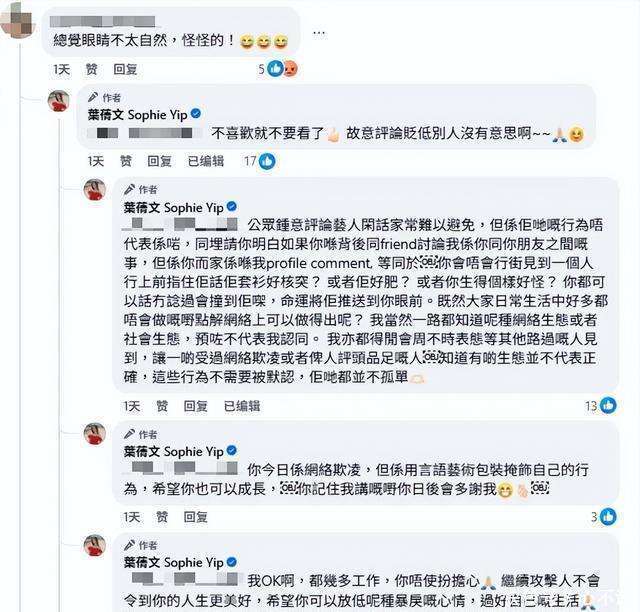 然而,也有一些网友对此提出了不同意见,认为她的眼睛似乎有些变化:是不是整过眼睛?看起来不一样了,之前的眼睛好像看着更舒服一些。面对这些评论,叶蒨文迅速作出了回应,她解释道:没有啊没有啊,化了个新妆容,戴了美瞳。但有网友依然觉得她的眼睛看起来不太自然,甚至觉得有些怪异。对此,叶蒨文连发四条留言进行反击:不喜欢就不要看了,故意评论贬低别人没有意思啊~~