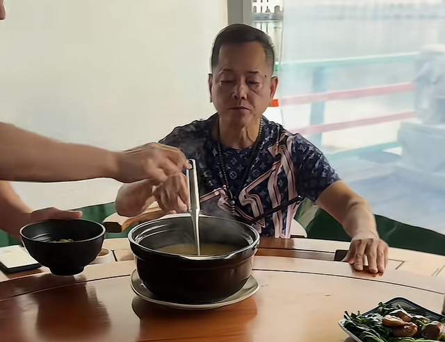 在崩牙驹的面前,有一个砂锅,一位看起来与其长相颇似的男子正在盛东西,崩牙驹则指着他的碗让其赶紧盛,另外一边也有一个类似的砂锅,除此之外,桌面上还摆放着几个菜品,看起来很简单。