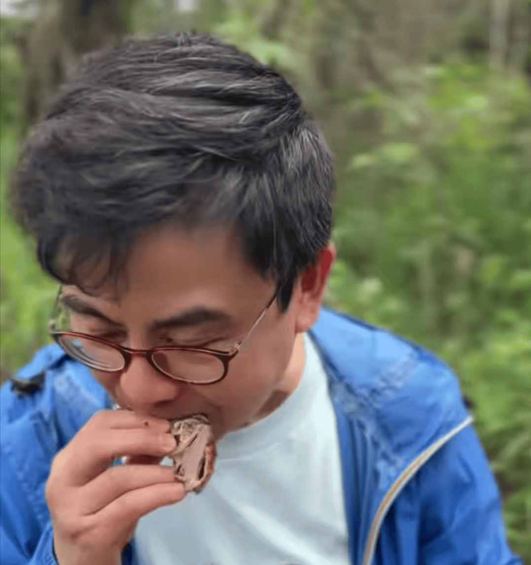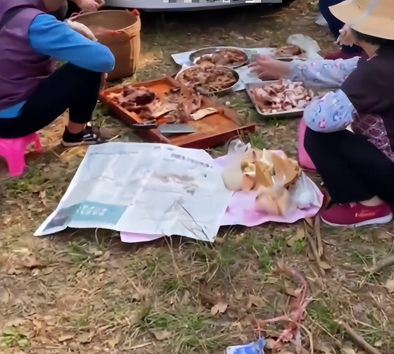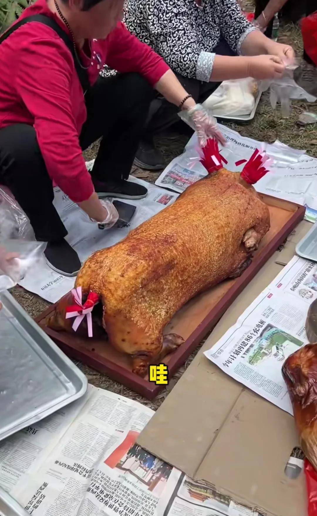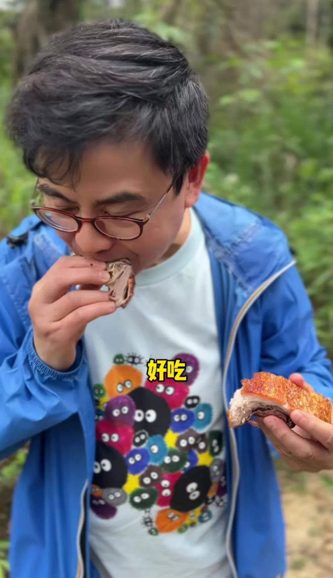 拜祭完,大家没急着下山。有人从包里掏出几张报纸往地上一铺,像在宣布一件大事:开饭。刀子下去,肉皮“咔”一下断开,油光在山风里发亮。黄一山接过一块,没戴手套,没拿筷子,徒手就咬,油顺着手指往下滴,他还笑着冲镜头点头,那表情像在说:这口值了。