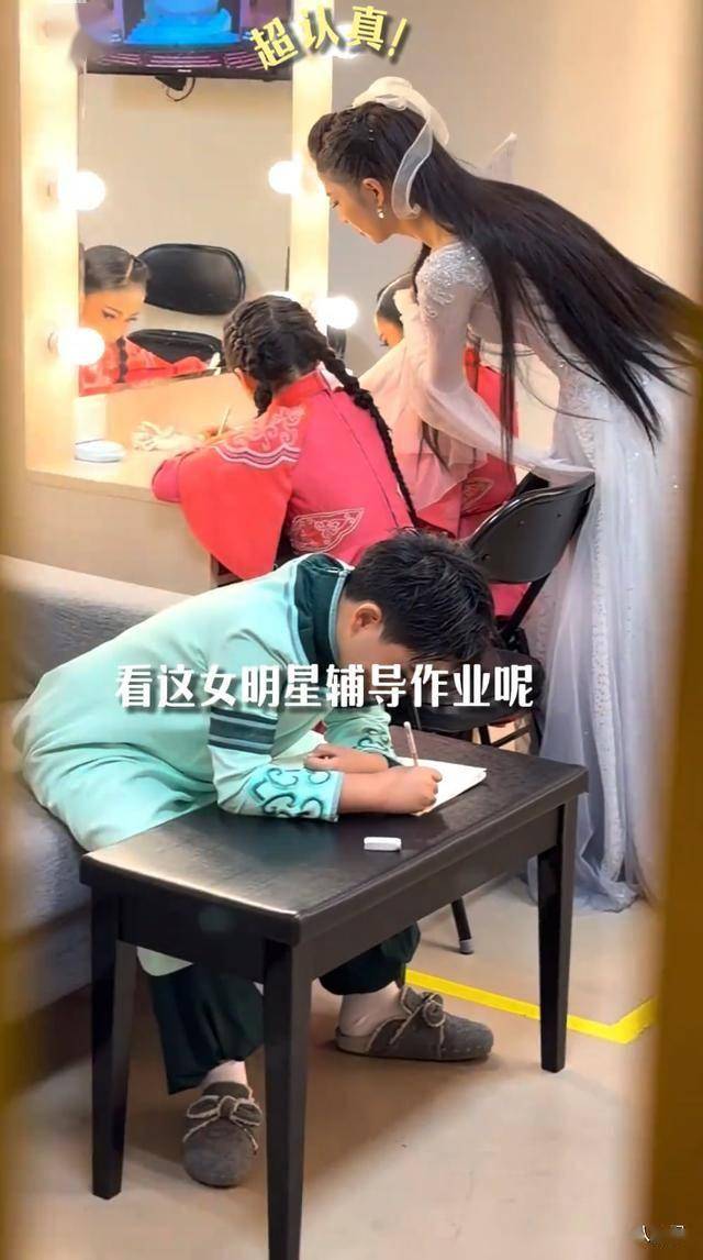 佟丽娅后台辅导孩子功课