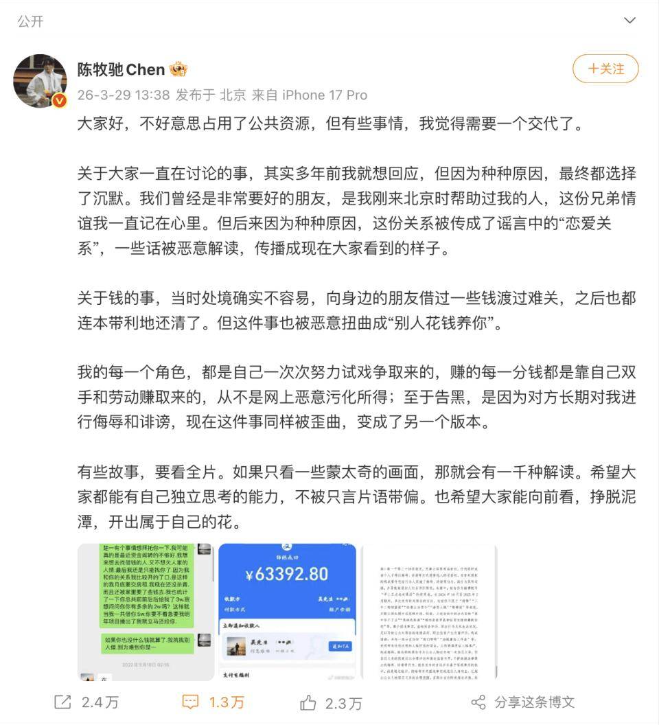 随后,吴楚一夜发文回应了陈牧驰,看起来像是两清的样子。