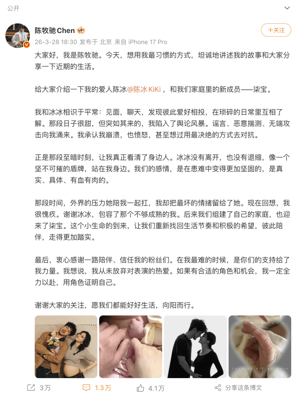 3月28日,演员陈牧驰发微博,官宣自己与演员陈冰已婚生子的消息。