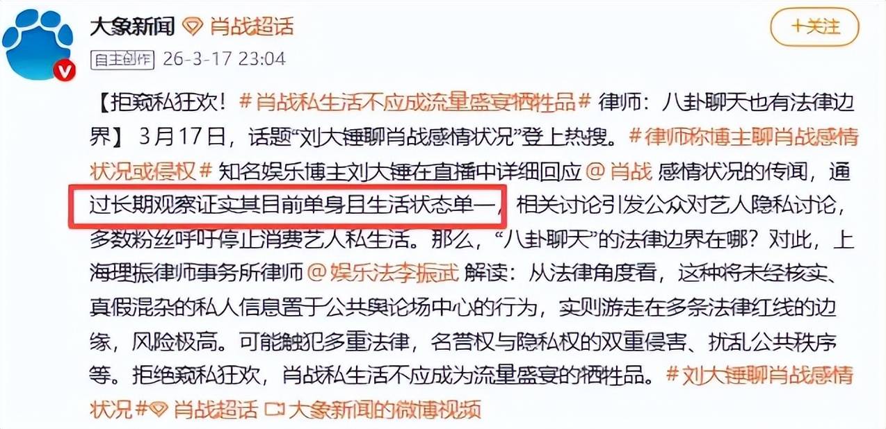 连狗仔也对此感到无奈。半个月前,知名狗仔刘大锤发布消息称,他长期观察肖战,发现其每日出门工作,生活独立自理,现阶段仍是单身,长期未与任何人谈恋爱。
