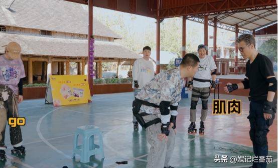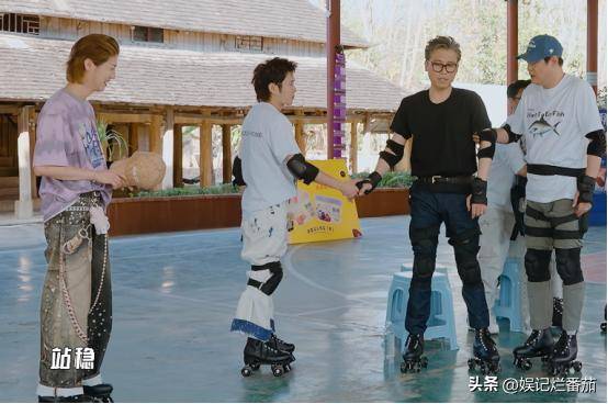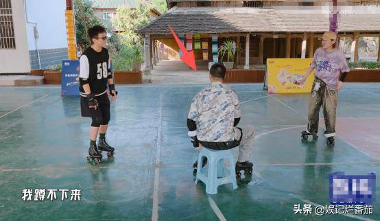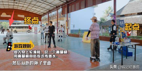 来到穿滑轮鞋传递水的游戏,他干脆坐在凳子上传递,毫无游戏精神,还一直说好烦。