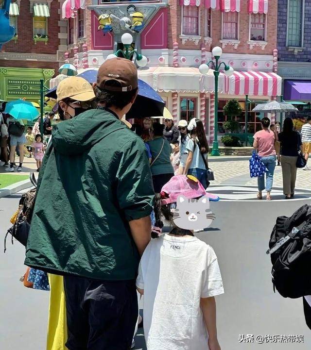 两人还特意戴着同款的鸭舌帽,暗戳戳的秀恩爱。小朋友则是蹦蹦跳跳的跟在爸爸妈妈身边,头上还有一个蝴蝶结。