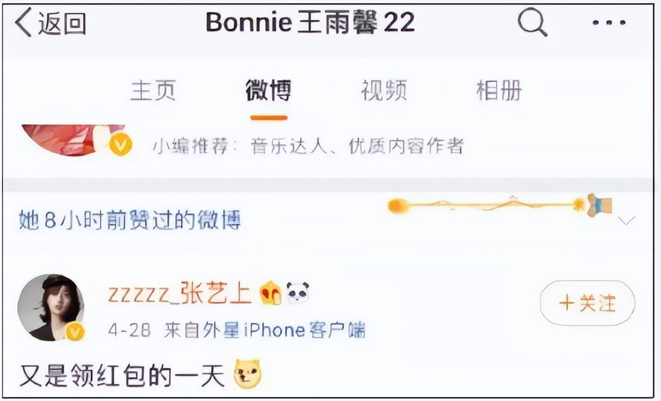 之后,王雨馨又甩出重磅消息暗示两人之间存在第三者,并点赞了多条张艺上微博。同时,还用小号手撕张小姐,嘲讽对方趁着主人不在家串门挑衅。她的朋友也连续发文怒骂,于是张艺上被质疑破坏他人家庭。