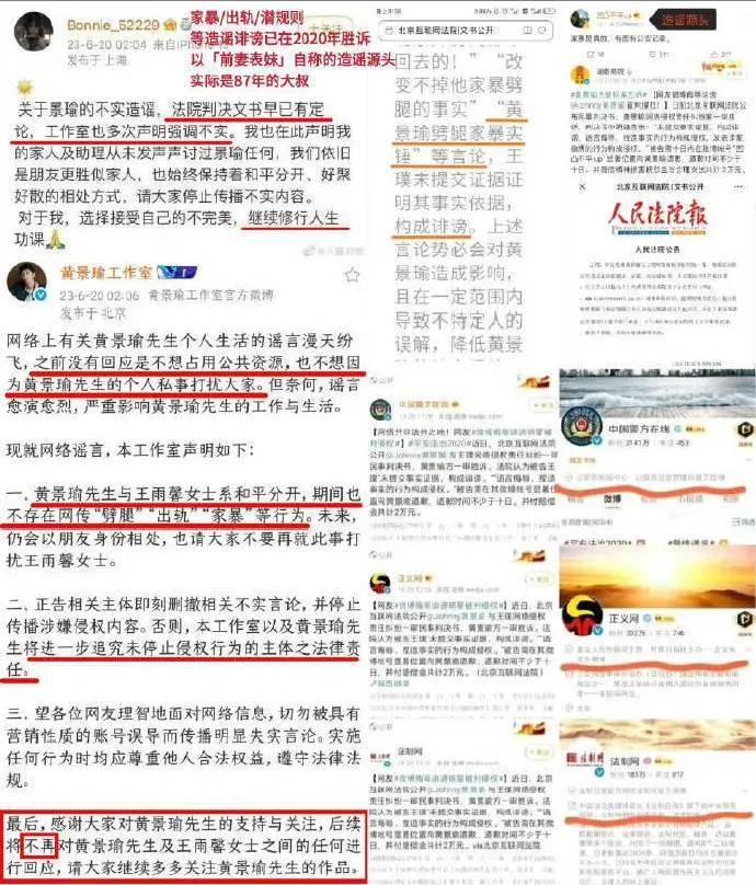 2019年,黄景瑜告了替王雨馨发声的“凹凸不平”,否认家暴等指控,法院判赢。王雨馨也发文表所有都是假的,看起来两方和解了。然而,在这之后的数年,王雨馨和黄景瑜的拉扯并没有结束,王雨馨时不时撕一下黄景瑜。终于在2023年,黄景瑜承认了这段婚姻的存在,王雨馨也发文表示家人、助理等从未声讨黄景瑜,强调黄景瑜相关争议法院已有判决。