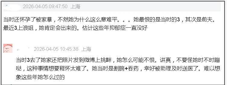 那张艺上为何如此遭王雨馨恨呢?不少网友分析她的心路历程,表示她最恨的是第三者,其次是前夫,毕竟他们是导致她人生发生剧变的关键因素,遭遇的怀孕流产、家暴、抑郁轻生、长期网暴都来自于此。
