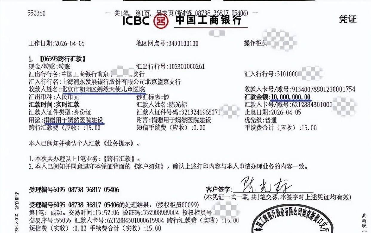 陈光标在4月5日的决定,让这笔捐款提前到账。 他晒出的银行凭证显示,汇款金额1000万元,收款人姓名是北京市朝阳区嫣然天使儿童医院。 凭证上的操作日期是2026年4月5日,汇款时间标注为“实时汇款”。