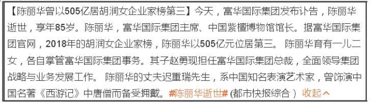4月7日,富华国际集团发布讣告宣布陈丽华女士因病医治无效在京逝世,享年85岁。消息一出,不少网友立马联想到她的巨额遗产如何处置,二婚丈夫迟重瑞能分多少?
