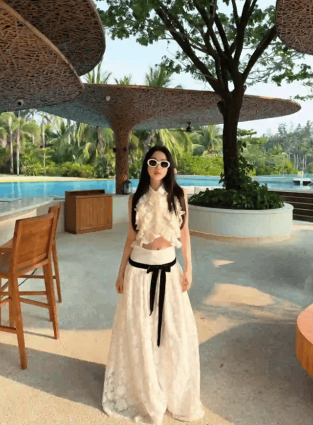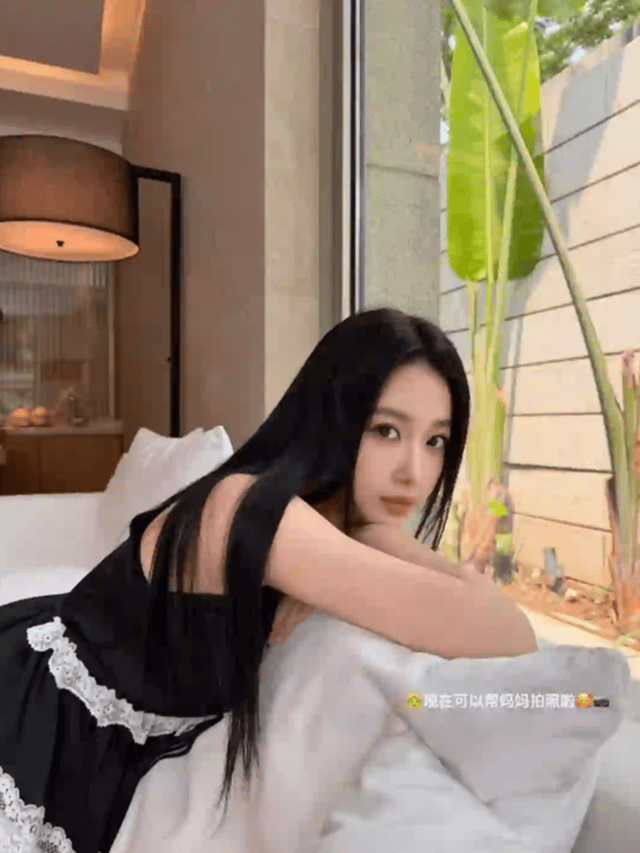 宣云也有晒出女儿为她拍摄的美照,女儿镜头下的她一头乌黑柔顺的长直发自然垂落在肩头与背部,发丝光泽感十足。宣云身穿一件黑色无袖连衣裙,裙身带有精致的白色蕾丝花边装饰,增添了一丝甜美与复古感。她侧身倚靠在柔软的白色床品上,双臂交叠枕于头下,姿态放松而慵懒。