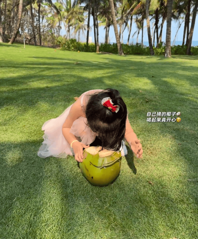 还有一张是女儿单人照,宣云镜头下在一片被阳光洒满的翠绿草坪上,穿着轻盈粉色纱裙的小公主正俯身趴在草地上,专注地抱着一个刚被劈开的大青椰子,似乎正迫不及待地想品尝里面的椰汁。她乌黑的长发被一个红白相间的发饰束起,手腕上还戴着一个淡黄色的手环。宣云透露这个椰子是女儿自己摘的,看得出来,小姑娘整个人都沉浸在收获的喜悦里。